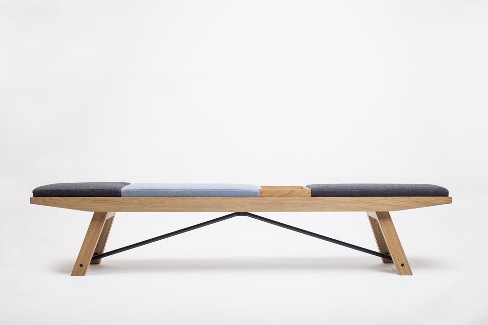 Dębowa ławka z tapicerowanymi elementami w stylowych kolorach i skrzynką na dokumenty lub drobiazgi w formacie A4. Każde zamówienie jest personalizowane przez wybór koloru tapicerki dla każdego elementu. Dzięki bardzo prostej wymianie elementów tapicerowanych, ławka z łatwością dopasowuje się do zmieniającego się wystroju wnętrza.